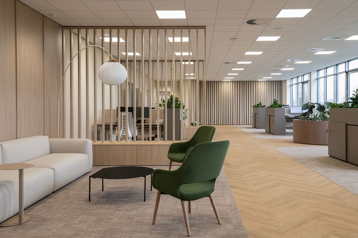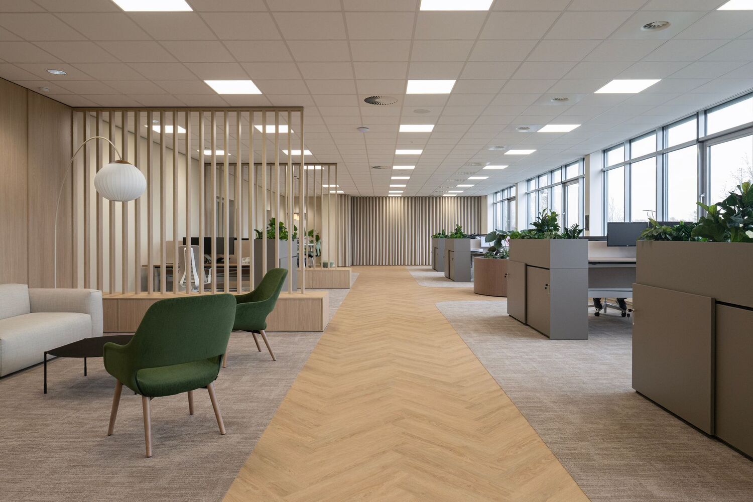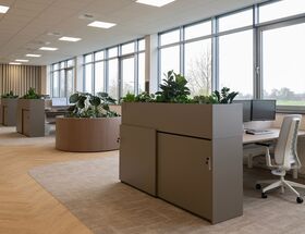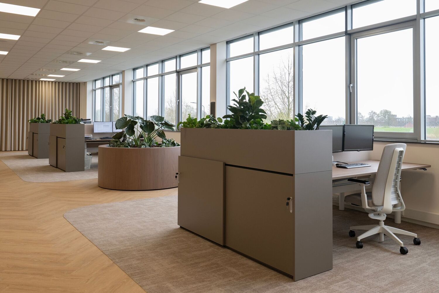 De schuifdeurkasten zijn een sfeervolle aanvulling binnen het ontwerp. In combinatie met de geïntegreerde plantenbakken brengen zij op elegante wijze afscheiding, opbergruimte en groen samen in één functioneel interieurelement.