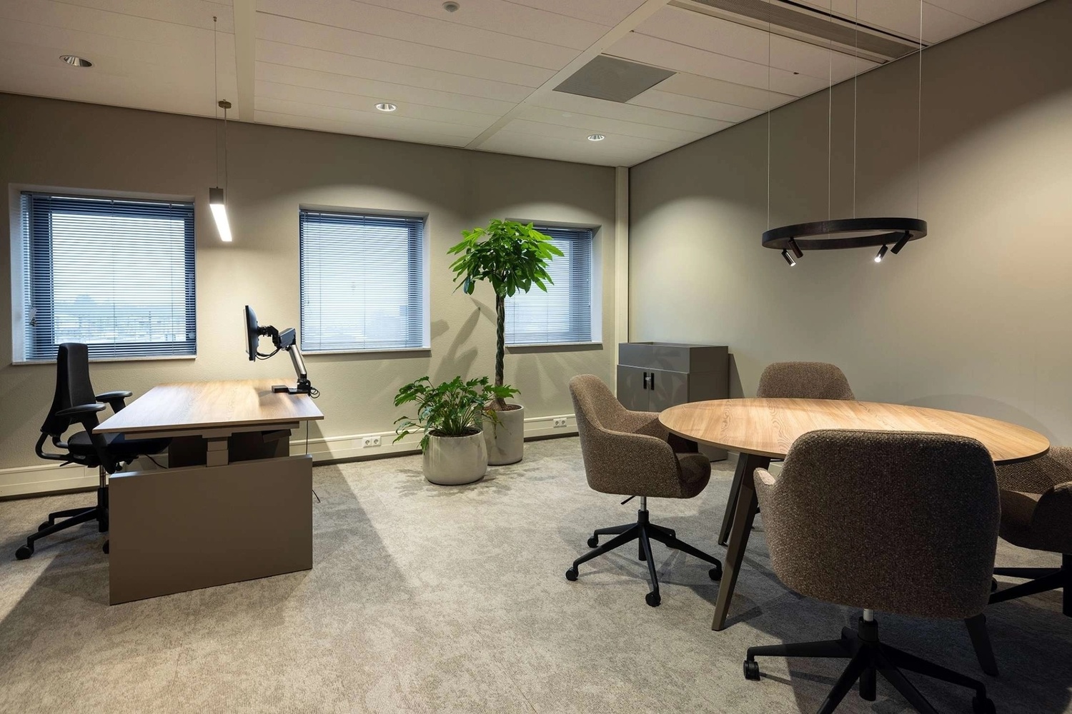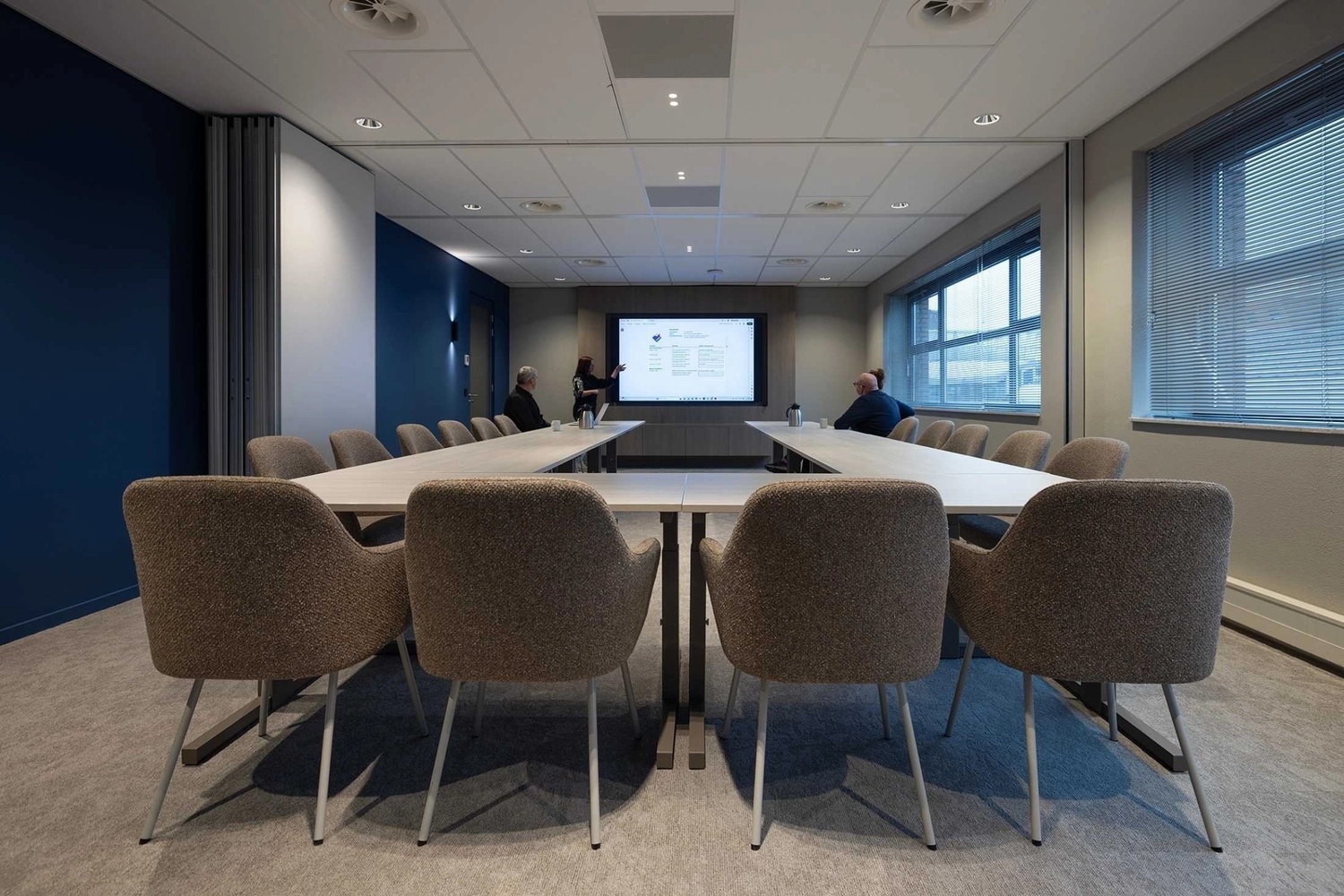 Voor de werkplekken is gekozen voor Hi Tee werkplekken, strak vormgegeven, ergonomisch en flexibel inzetbaar. Deze werkplekken ondersteunen verschillende werkstijlen en dragen bij aan een comfortabele en efficiƫnte werkomgeving. De Tabs vergadertafels zorgen voor een uniforme en representatieve uitstraling, passend bij zowel formele overleggen als informele bijeenkomsten.